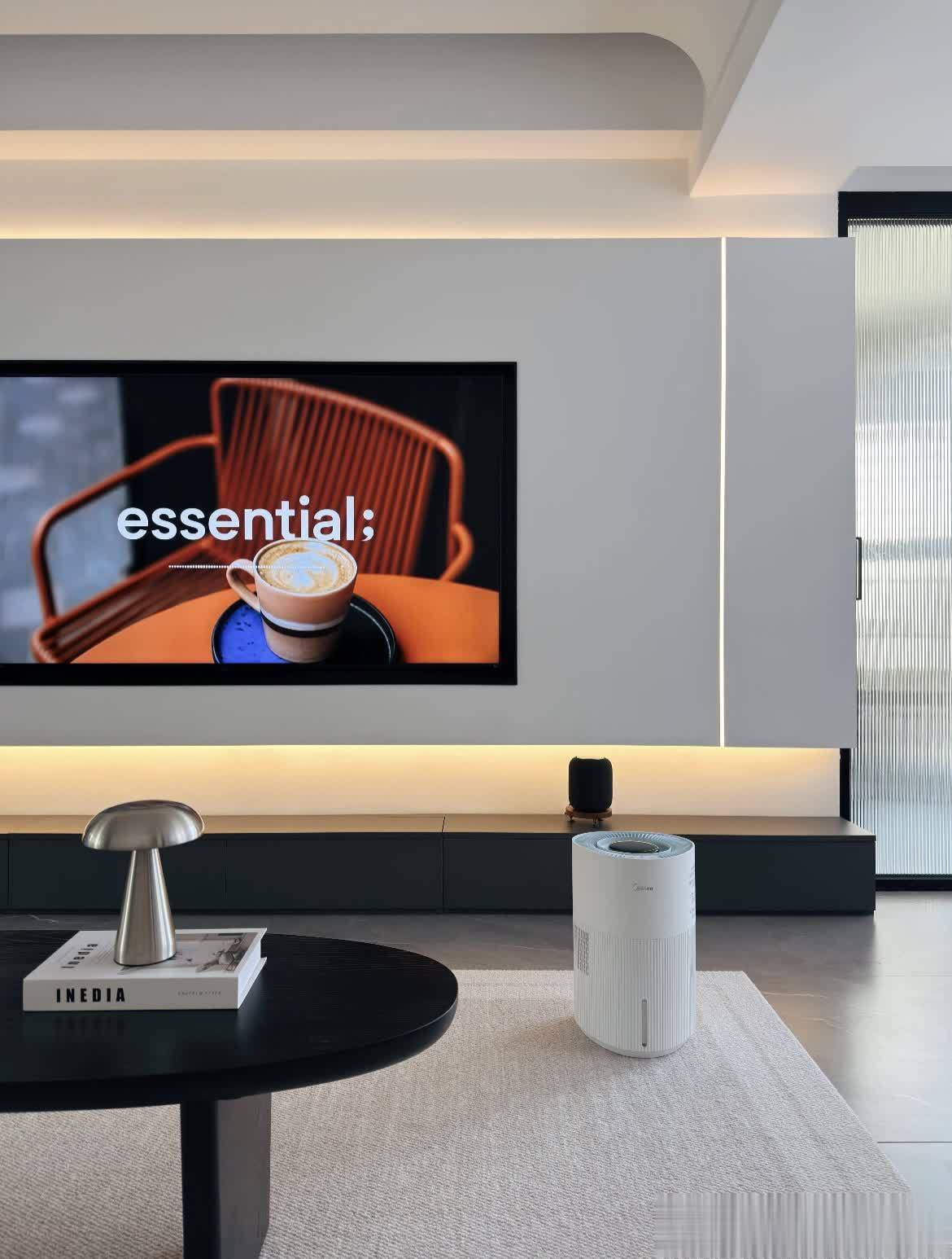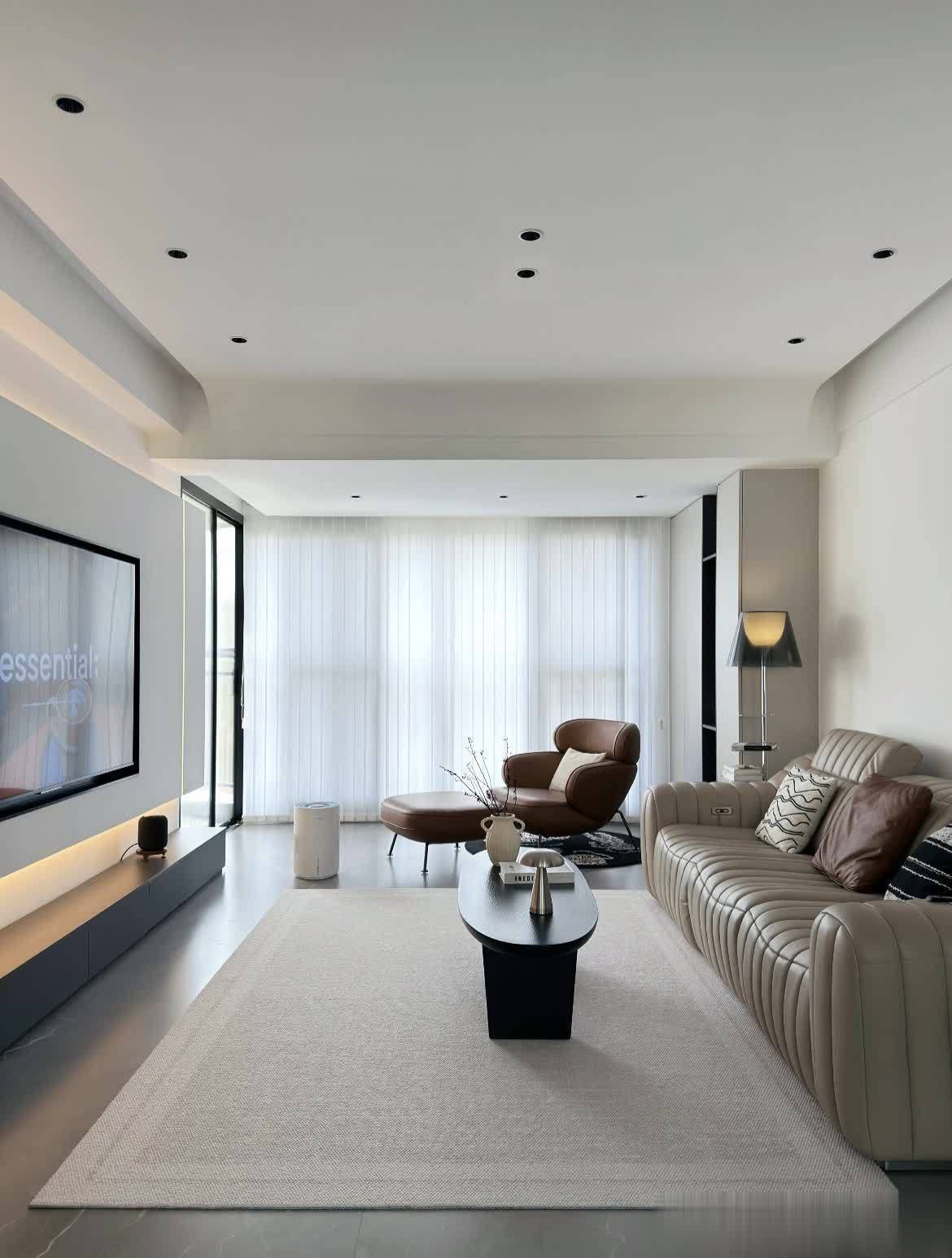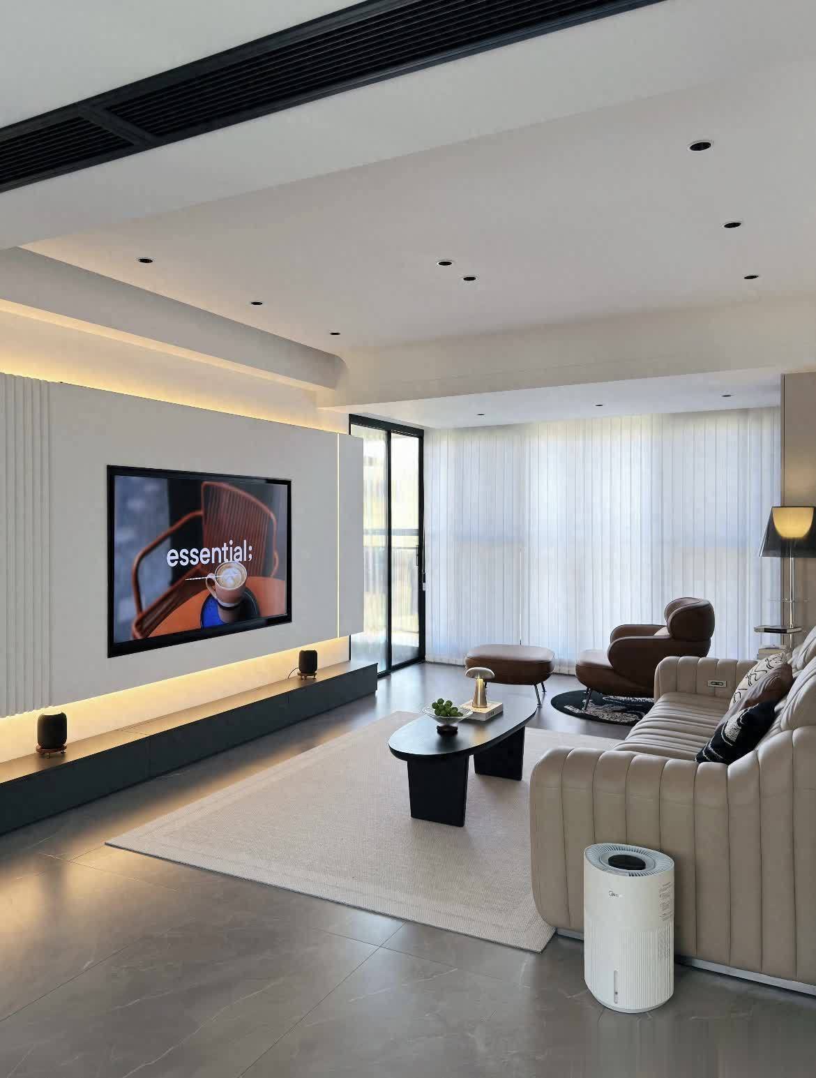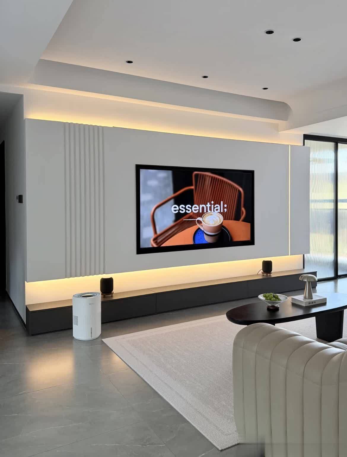 石膏板电视背景墙,客厅的颜值担当!推荐嵌入3000K线性灯带,灯光一开,层次感拉满,晚上窝沙发看电影,氛围感绝了!