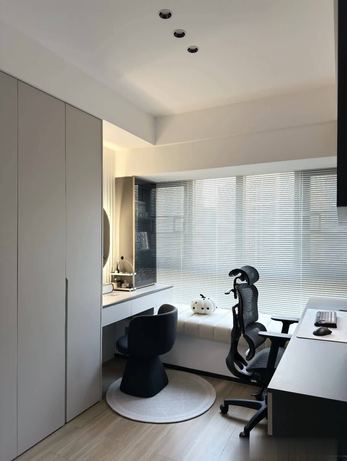 化妆区:化妆桌长86cm x 深55cm x 高80cm,和衣柜连在一起做了一体化设计,护肤品化妆品都能轻松收纳,搭配了一张轻奢黑色旋转化妆凳,高级感爆棚✨,衣柜区,四门整面墙做到顶,2.4米高,免拉手设计简约,衣柜转角墙面,我挂了一面全身镜,真的yyds!显大又实用~