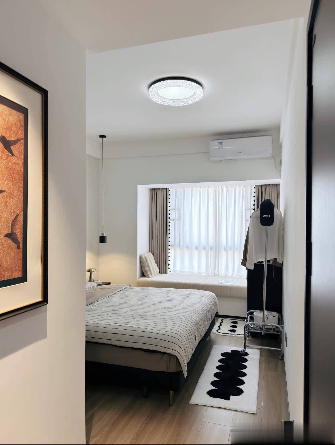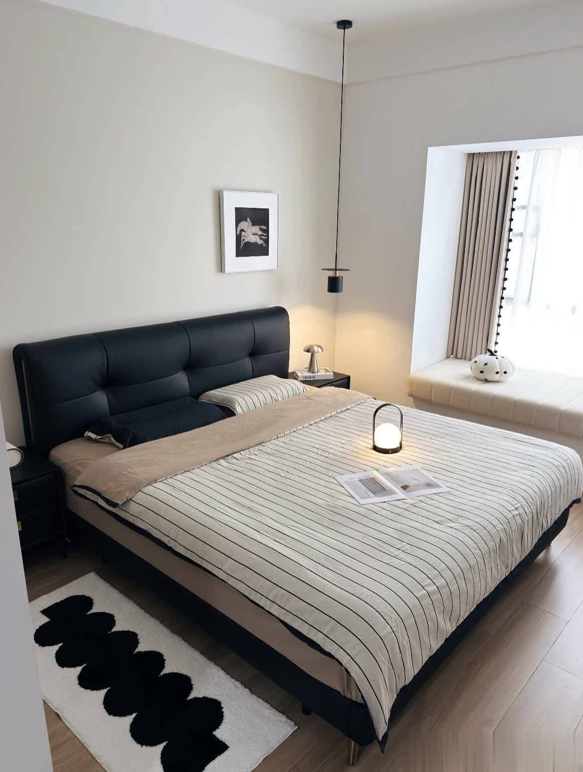 主卧没做吊顶,简单走了一圈单眼皮石膏线,一门到顶衣柜设计简洁,柜深55cm,免拉手设计,既实用又耐看~ 放了一张1.8米的◼️黑色真皮床,搭配黑白条纹四件套,舒适而不失格调,房间空间虽然不大,但完全够用,没有过多的软装,都是一些灵活移动的摆件,这个房间,是让我每天回家最放松的地方。