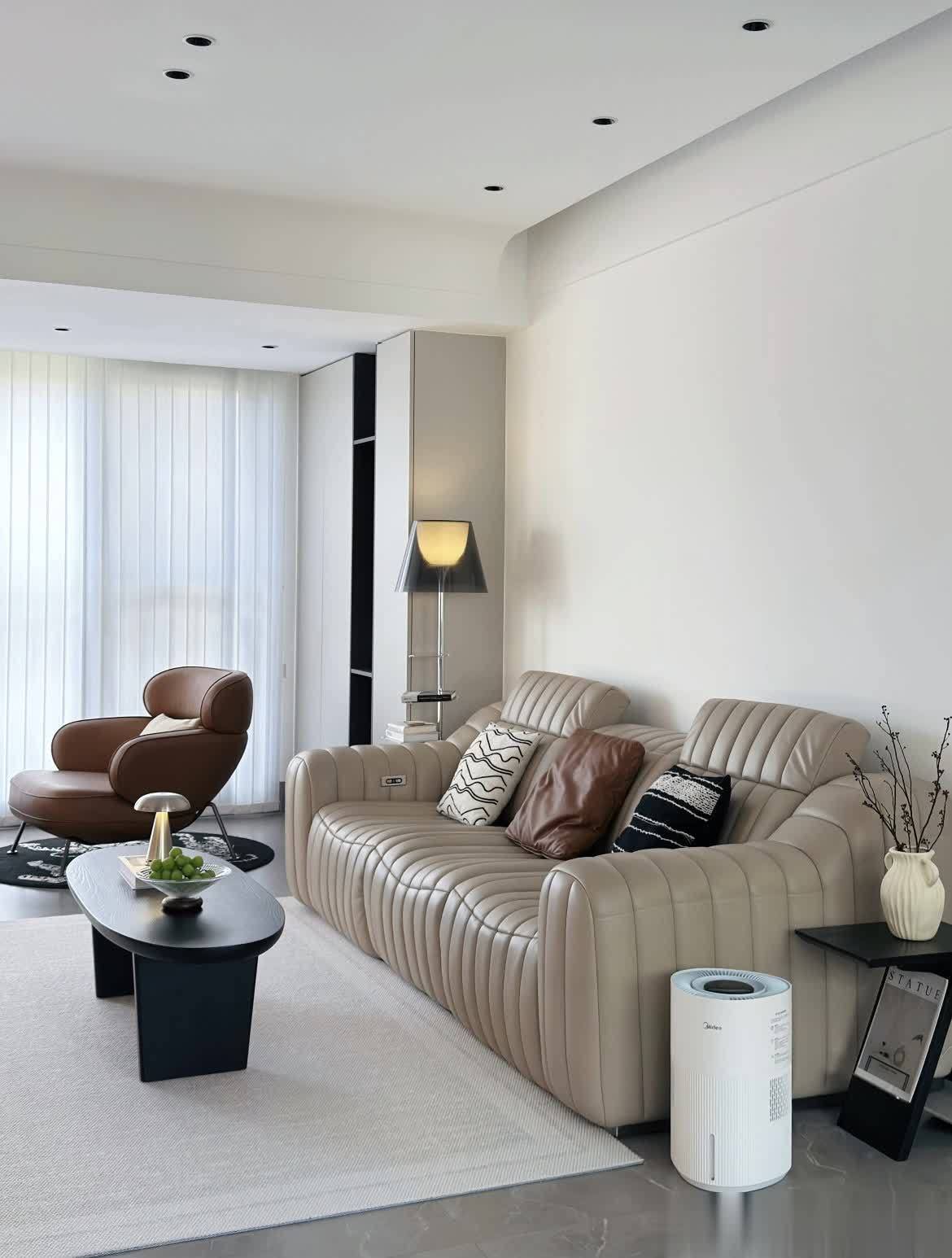 地面通铺了浅米色柔光砖,不仅好打理,还能自然反射光线。白天采光充足,整个客厅通透明亮;晚上打开灯光,立马变身高级感满满的治愈小窝。
